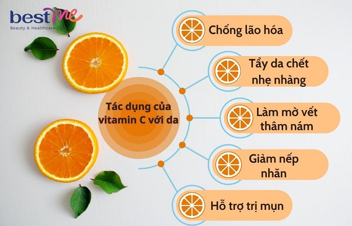 - Trị thâm nám: nhờ khả năng chống oxy hóa vượt trội, Vitamin nhóm C sẽ cải thiện nhiều vấn đề liên quan đến sắc tố da như sạm, thâm nám,...