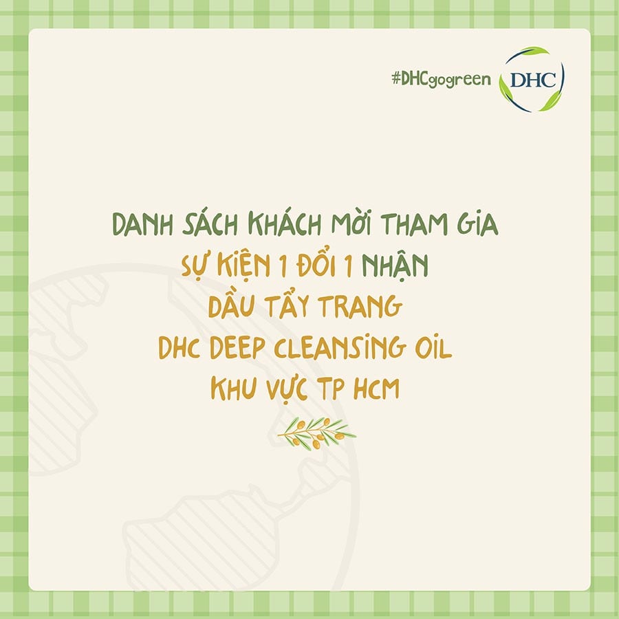 DHC Vietnam chúc mừng những bạn có tên sau đã trở thành 1 trong 150 khách mời của sự kiện 1 ĐỔI 1 để nhận quà tặng dầu tẩy trang #DHCDeepCleansingOil 70ml trị giá 299.000đ, cùng với các phần quà vô cùng hấp dẫn khác.